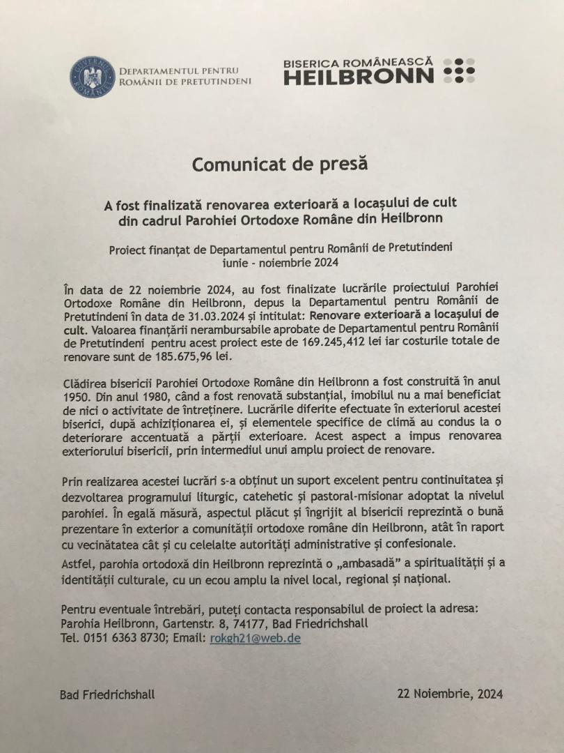 Finalizare proiect: Renovare exterioară a locașului de cult din parohia Heilbronn